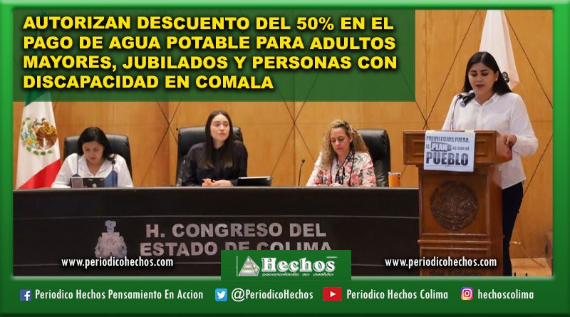 El pleno del Congreso del Estado de Colima, autorizó a la Comisión de Agua Potable y Alcantarillado del Municipio de Comala, aplicar el descuento del 50% en el pago de derechos por el servicio de agua potable, alcantarillado y Saneamiento, en favor de los usuarios que acrediten tener la calidad de adultos mayores, personas con discapacidad y pensionados o jubilados, a partir del día siguiente de su aprobación hasta el 31 de diciembre del 2026.