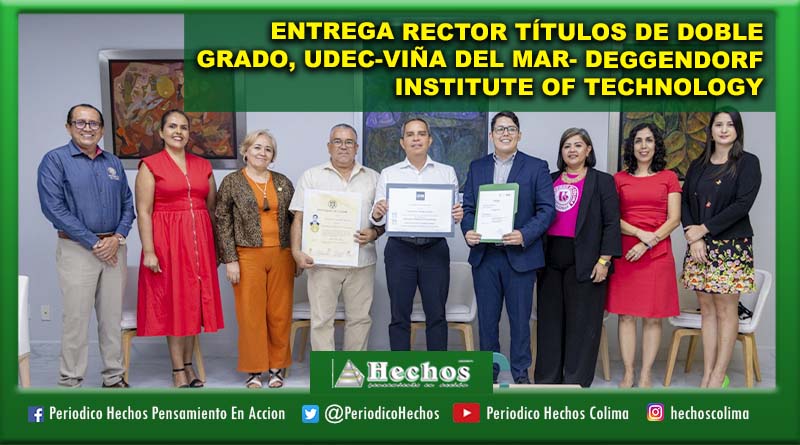 Cecilia García celebró la entrega de los títulos de doble grado “a dos talentosos egresados que culminaron con éxito su formación académica”. En ese sentido, compartió que, a la fecha, son 32 los estudiantes de la Universidad de Colima que han recibido un título de doble grado de la Universidad de Viña del Mar y cinco del Deggendorf Institute of Technology en Alemania.