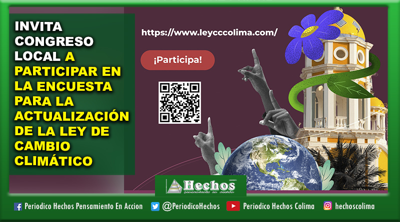 El Honorable Congreso del Estado de Colima, en coordinación con el Gobierno del Estado de Colima a través del Instituto para el Medio Ambiente y Desarrollo Sostenible del Estado de Colima (IMADES), invita a las y los colimenses a participar en la encuesta que se realiza como parte del proceso de actualización de la Ley para la Mitigación y Adaptación ante los Efectos del Cambio Climático del Estado de Colima.