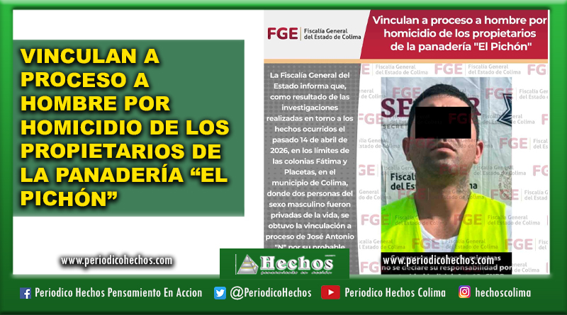 La Fiscalía General del Estado informa que, como resultado de las investigaciones realizadas en torno a los hechos ocurridos el pasado 14 de abril de 2026, en los límites de las colonias Fátima y Placetas, en el municipio de Colima, donde dos personas del sexo masculino fueron privadas de la vida, se obtuvo la vinculación a proceso de José Antonio “N” por su probable responsabilidad en el delito de homicidio.